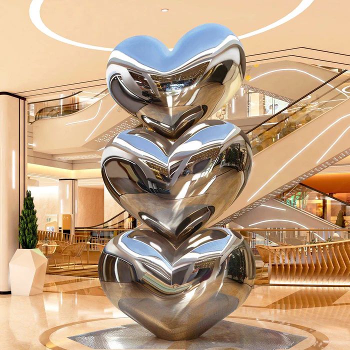 Escultura de Aço Inoxidável com Acabamento Espelhado e Corações Empilhados para Decoração de Hotel