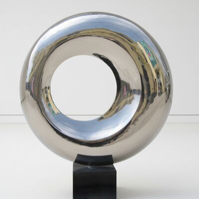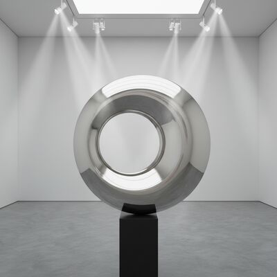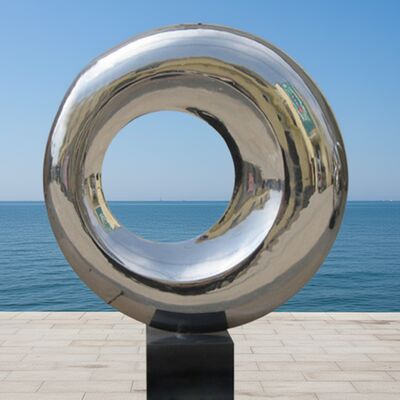 Esta obra de arte moderna em aço inoxidável apresenta uma superfície espelhada de alto brilho que captura a luz e o ambiente, transformando a forma circular abstrata em um ponto focal dinâmico para qualquer espaço moderno.