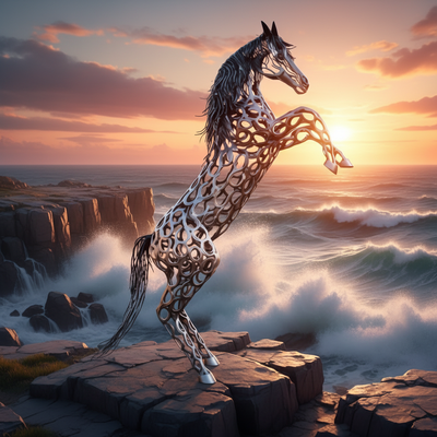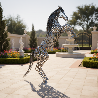This striking outdoor stainless steel art statue features a dynamic rearing horse crafted from interlocking metal rings. Perfect for lawns, patios, or estate landscapes, its reflective surface catches sunlight beautifully against trees and greenery. A bold statement piece that blends modern design with nature’s elegance.e.